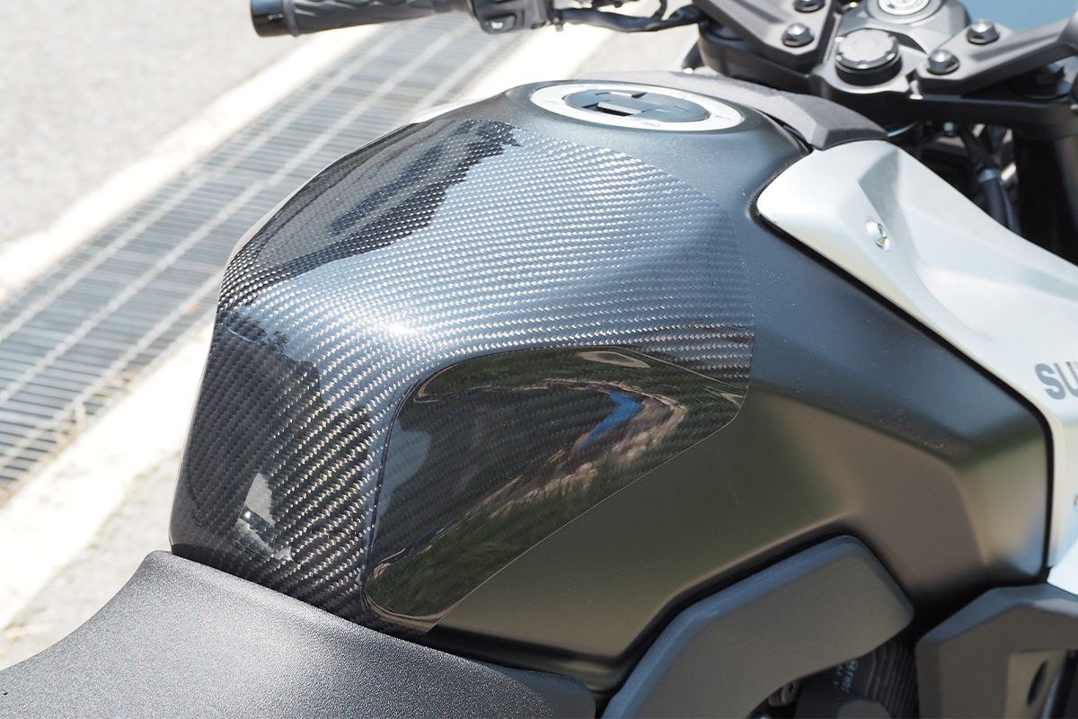 よりニーグリップしやすくなるよう、中空モノコック構造にすることで形状を変化させている。コーナーリング時やブレーキング時にフォームが安定しやすい。ガソリンタンクへのキズつき防止効果も改定できる。「FRP・黒」「平織りカーボン」「綾織りカーボン」が用意されているぞ。