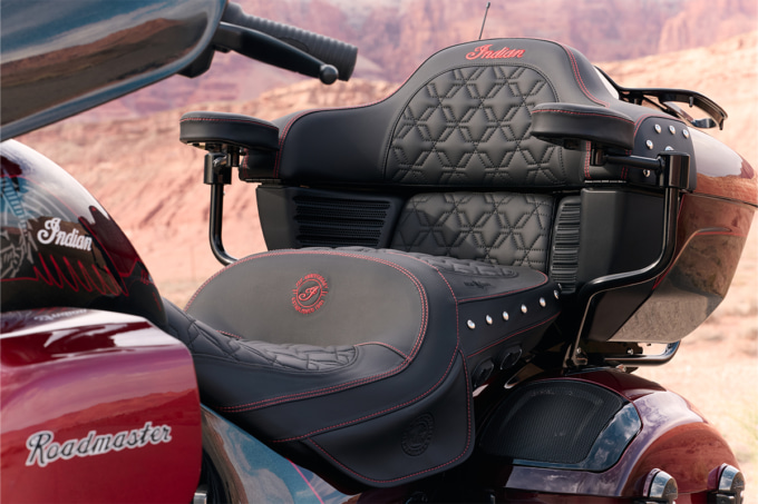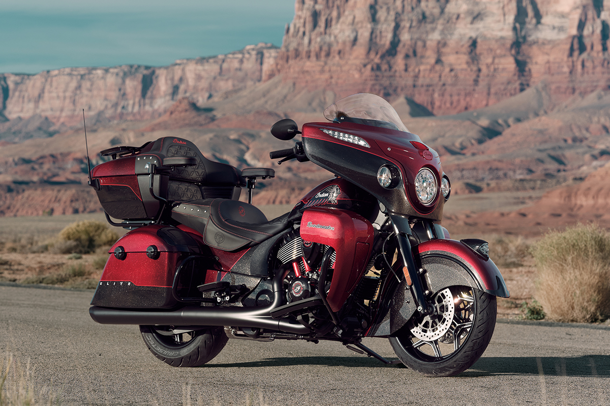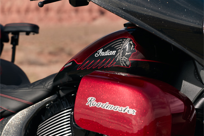 Roadmasterは、ロングツーリングの象徴。スカートフェンダーとフォークマウントフェアリングが醸し出す威厳ある佇まいに、空冷Thunderstroke 116の豊かなトルクが組み合わさる。