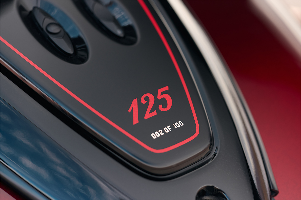 それを記念して発表されたのが、ハンドペイントによる特別な“125th Anniversary Edition”コレクション。ブラッククリスタルを配した専用レッド、メタリックマイクロフレークの輝き、そしてかすれ文字で刻まれた“ONE HUNDRED TWENTY-FIFTH ANNIVERSARY”のピンストライプ。すべてのモデルにシリアルナンバーが刻まれる、世界限定の希少車である。
