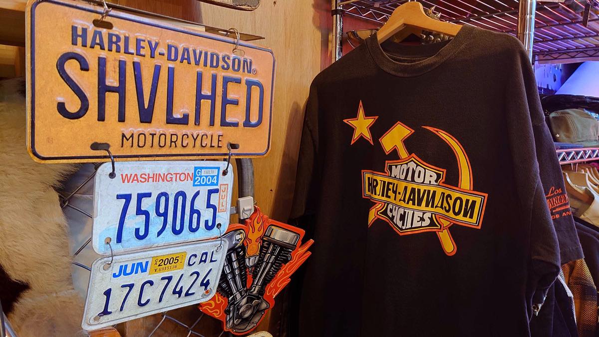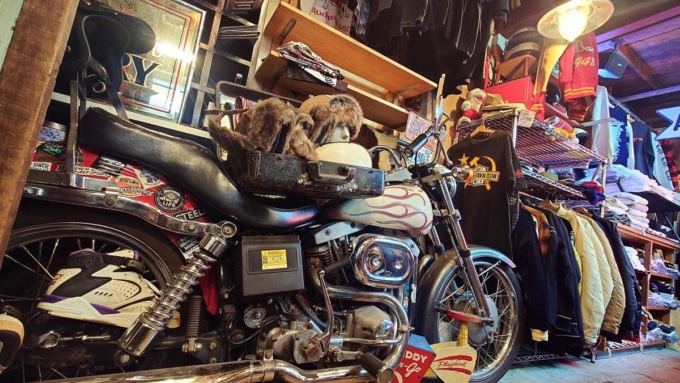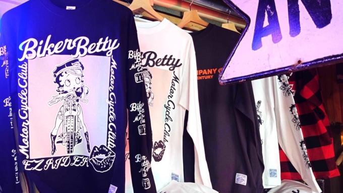 店内にはハーレーがディスプレイとして置かれてアメリカンな雰囲気も◎。高円寺駅からも歩ける距離なので、ついでに古着屋巡りをするのも楽しい場所だ。人気の“ベティ”とコラボした新作ロンTとカーハートのパンツがおススメ!