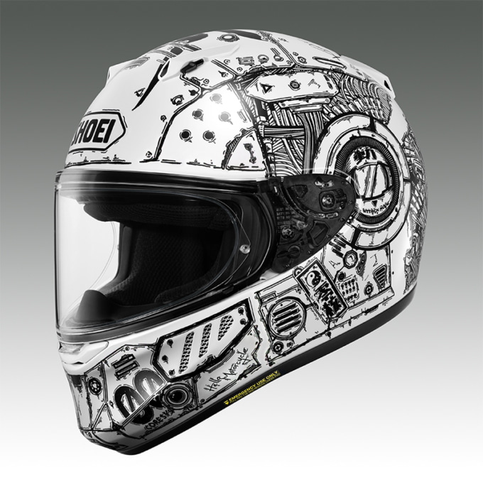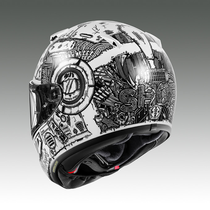 ZERO CODEのグラフィックは、メカニカルなモチーフやパーツのディテールを緻密なラインワークで描き込んだ独特のデザインが特徴。ホワイトベースのヘルメット全体にブラックのイラストが広がり、まるで機械の内部構造を覗き込んでいるかのようなビジュアルに仕上げられている。その複雑なラインは、バイクやエンジン、メカニズムを象徴するモーターカルチャーの世界観を表現。走りを愛するライダーの感性に響く、アート性の高いグラフィックと言えるだろう。