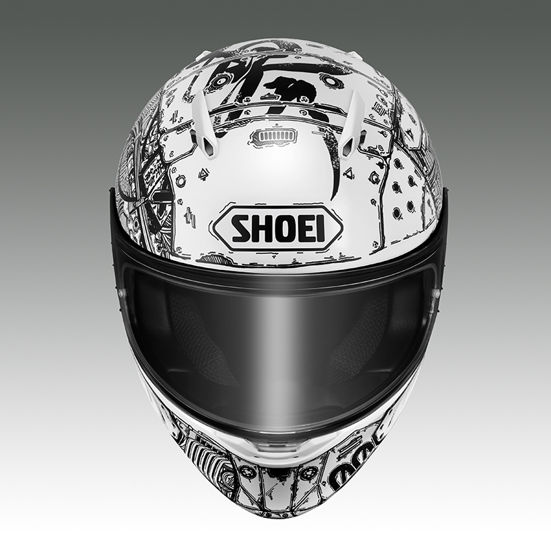 ZERO CODEのグラフィックは、メカニカルなモチーフやパーツのディテールを緻密なラインワークで描き込んだ独特のデザインが特徴。ホワイトベースのヘルメット全体にブラックのイラストが広がり、まるで機械の内部構造を覗き込んでいるかのようなビジュアルに仕上げられている。その複雑なラインは、バイクやエンジン、メカニズムを象徴するモーターカルチャーの世界観を表現。走りを愛するライダーの感性に響く、アート性の高いグラフィックと言えるだろう。