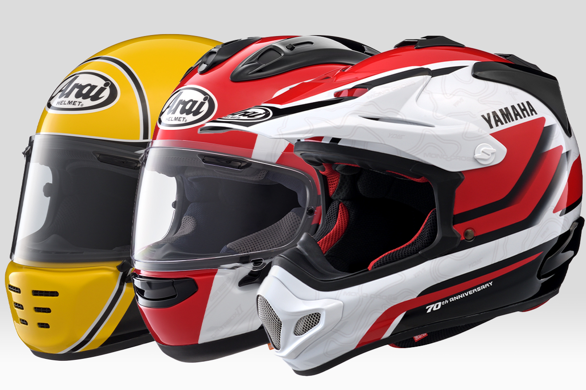 ヤマハの歴史を背負った特別なグラフィックを、アライの名作ヘルメットに落とし込んだ限定モデルが登場した。ベースとなるのは、フルフェイスの名作「RX-7X」、ネオクラシックの「ラパイド・ネオ」、そしてオフロードの「Vクロス4」。それぞれの個性に、ヤマハ70周年のDNAが宿る、見逃し厳禁のラインナップである。