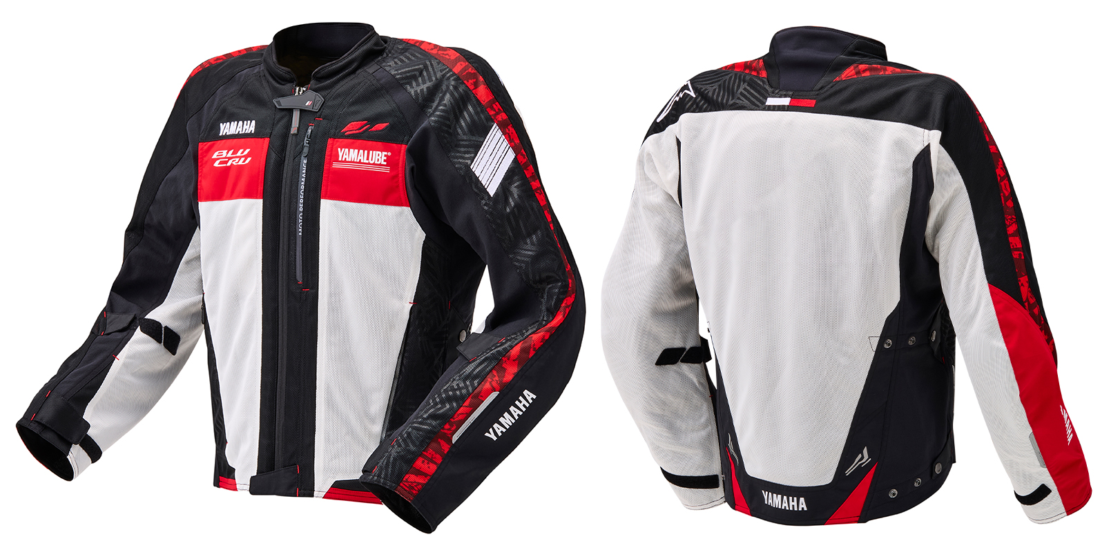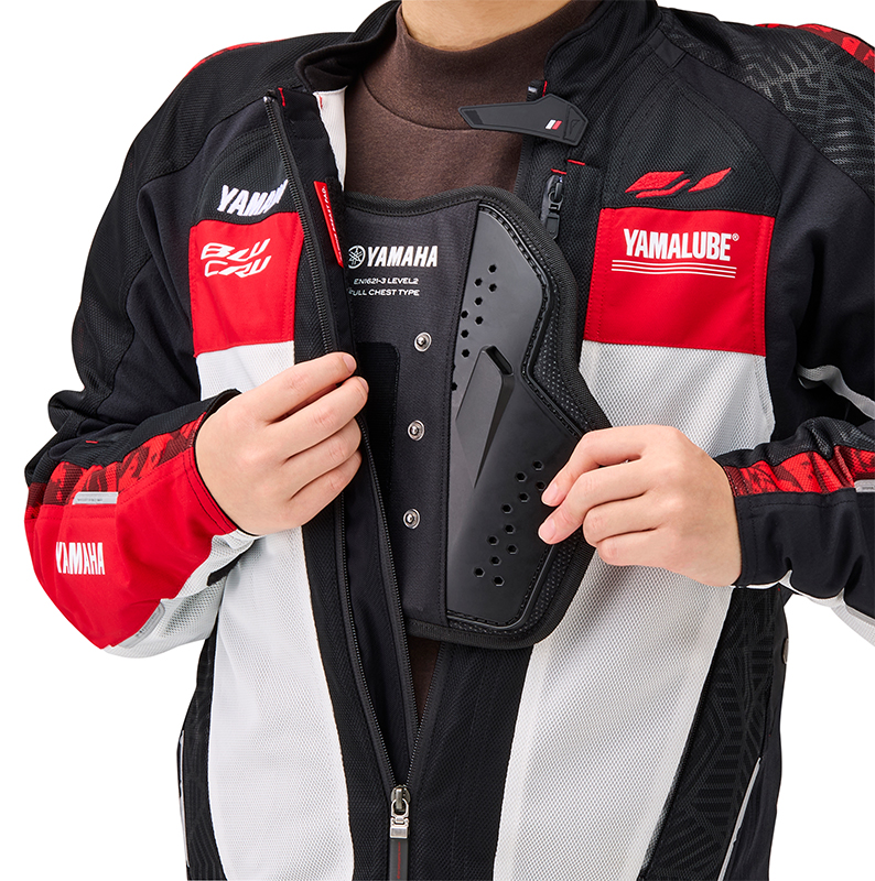 ヤマハ70周年を記念した特別カラーは、2026年モデルのYZF-Rシリーズをイメージしたレーシーなデザイン。胸元にはBLU CRUロゴやYAMALUBEロゴ、そして象徴的なスピードブロックが配置され、まさに“着るヤマハスポーツ”と呼びたくなる仕上がりだ。