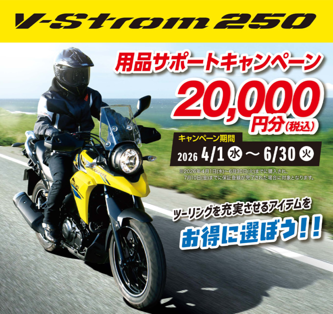 これからバイクを買って、少しずつツーリングを楽しんでみたい。そんなビギナーライダーにとって、車両選びと同じくらい気になるのが「最初にそろえる用品にどれくらいお金がかかるか」という点である。そんな不安をやわらげてくれそうなのが、スズキのVストローム250で実施される用品サポートキャンペーンだ。期間中、キャンペーン実施店でVストローム250の新車を購入すると、用品の購入に使える2万円分(税込)のクーポンがプレゼントされる。