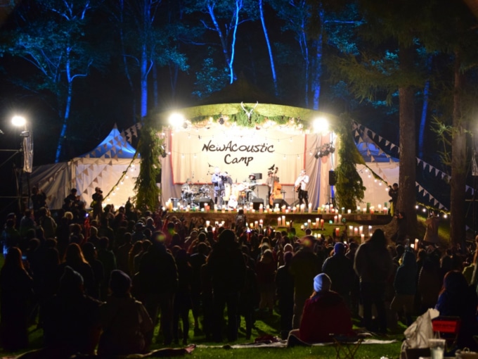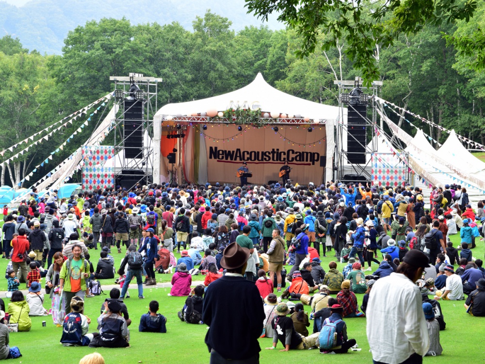 “New Acoustic Camp”は、一面の緑の芝生と白樺の群生に囲まれた会場で、全出演アーティストがアコースティック編成で出演するキャンプイベントだ。広大な敷地に点在するステージを歩きながら巡り、気になる音に足を止め、腹が減ったらこだわりのフードを楽しみ、疲れたら芝生に寝転ぶ。ステージ前で構え続けるだけのフェスとは少し違う、自由で穏やかな空気感がこのイベント最大の魅力である。